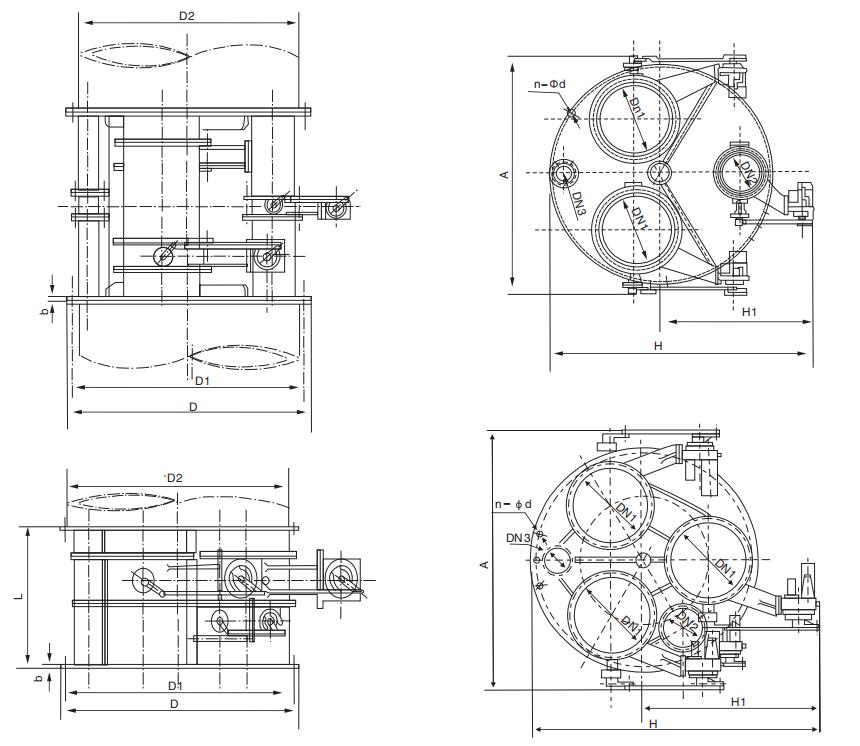 型號 D D1 L b n-Φd A A1 Η H1 閥門配制 許用流量(m3/h) 重量(kg) 對應 管道